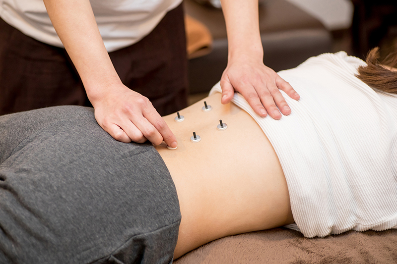 ツボや経路(ツボの流れ)をはりで刺激します。人が本来持っている自然治癒力に働きかけ、硬くなった筋肉の深部の緊張や痛みを取り除きます。施術に用いられる鍼は直径約0.2ミリ(毛髪程度の太さ)で、痛みを感じることはほとんどありません。また衛生的なディスポ鍼(使い捨て)を使用しておりますのでご安心ください。